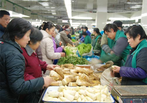 “大白菜0.4元/斤,蘿卜0.5元/斤,花菜1.3元/斤”,在朝陽農貿市場一樓賣蔬菜的王老板,一天銷量在5000斤左右。提起價格,王老板反映比去年同期便宜,像大白菜去年要賣到1元/斤。冬筍只賣8元/斤,而去年賣到12-13元/斤。經營戶表示,今年是冬筍產量的大年,貨源多,春節前漲幅不大。