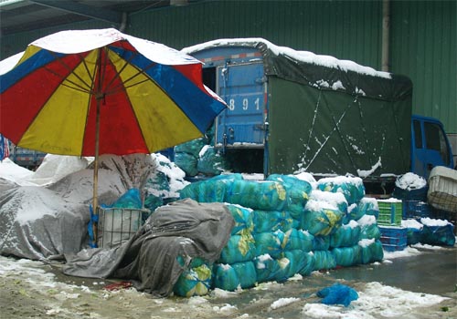 清晨,雪中的朝陽農產品大市場蔬菜區已經結束了繁忙的勞作,堆垛整齊的蔬菜庫存已經碼放完畢,為日后的蔬菜供應提供了可靠的保障。