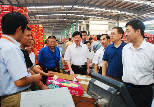 9月12日上午,無錫市委副書記、代市長汪泉,副市長劉霞等市政府領(lǐng)導(dǎo),率無錫市商務(wù)局、物價局等部門成員,來到無錫朝陽集團(tuán)農(nóng)產(chǎn)品大市場,調(diào)研無錫農(nóng)產(chǎn)品流通情況和中秋國慶兩大節(jié)日供應(yīng)工作。