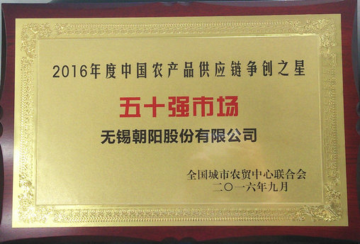 會上,無錫朝陽股份有限公司被評為“2016年度中國農產品供應鏈爭創之星五十強市場”,受到了大會表彰。
