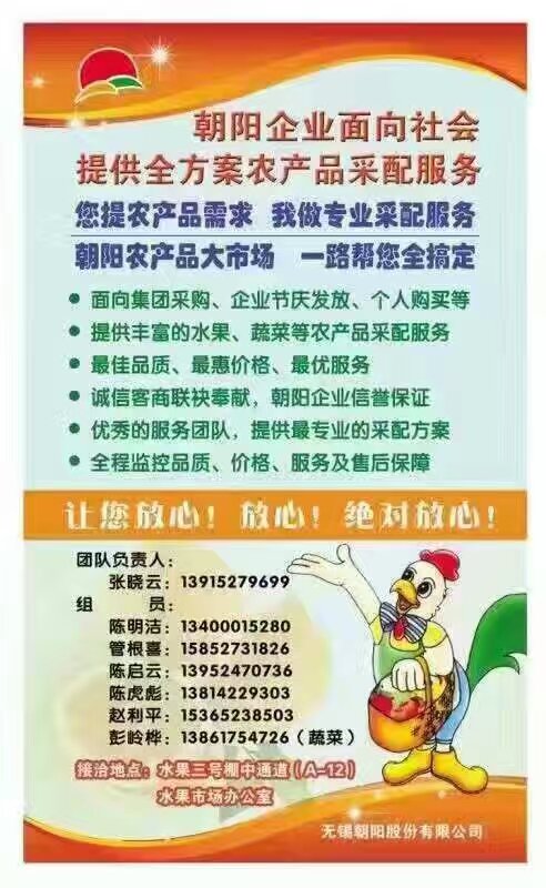 |   	  	春節(jié)臨近,各式花色水果紛紛亮相朝陽農(nóng)產(chǎn)品大市場,為無錫各路客商及消費者展現(xiàn)最完美的世界水果之窗。踏進朝陽農(nóng)產(chǎn)品大市場,眼前呈現(xiàn)的商品堆積如山,花色品種豐富,各類包裝、規(guī)格繁多,往往讓消費者看得眼花繚亂。怎么買,買什么一時難以定奪。作為無錫市的“果盤子”,朝陽農(nóng)產(chǎn)品大市場以滿足消費需求為己任,不斷推出惠民新舉措,現(xiàn)面向社會提供全方案農(nóng)產(chǎn)品采配服務(wù)。      2017年作為現(xiàn)代化品牌市場深化年,朝陽農(nóng)產(chǎn)品大市場將通過優(yōu)秀的批發(fā)交易大平臺,借助市場在蘇南地區(qū)獨一無二的集散影響力,與百余名最誠信的品牌客商聯(lián)手,挑選了最專業(yè)的精英團隊,為消費者介紹各類商品概況,推薦市場評定的品牌商品,明碼標價、凈重交易,以最惠的價格、最佳的品質(zhì)、最優(yōu)的服務(wù),為廣大消費者提供最專業(yè)的采配服務(wù),全程監(jiān)控品質(zhì)、價格、服務(wù)及售后保障,無弄虛作假、短斤少兩等后顧之憂,讓消費者買得絕對放心,展現(xiàn)朝陽企業(yè)的企業(yè)信譽。     朝陽農(nóng)產(chǎn)品大市場在水果三號棚中通道(A-12)、市場辦公區(qū)專門開辟區(qū)域,提供業(yè)務(wù)洽談、服務(wù)指南等,竭誠歡迎廣大消費者的光臨。