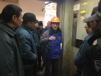 下午3點演練正式開始,農貿市場一部電梯在2層出現故障,停止運行,有多名乘客被困轎廂內。隨后被困人員撥打電梯警鈴請求救援。在接到被困人員求助后,維保人員告訴被困乘客一定要保持鎮靜,可做屈膝動作,不得撬砸電梯轎廂門,與電梯轎廂門保持一定距離。另外電梯維保人員也積極的展開救援,經過十分鐘的時間多名被困人員被成功解救。同時相關技術人員對故障電梯進行檢查,運行修復,確保電梯無故障。
