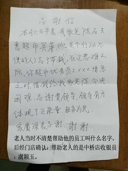 |   	3月8號上午,超市的員工都正在忙碌著,一位老太太很感慨地拉住了我,說道:“經(jīng)理,謝謝你們,你一定要幫我表揚你們的收銀員啊”,原來是我們的一位收銀員虞穎玉在收銀過程中幫助了她的老伴。 	阿姨跟我娓娓道來事情的原由,她的老伴是一位腦梗初逾的老人,家人為讓他每天有所鍛煉,平時也讓他買買東西,這天他在超市買好菜就去結(jié)款,但結(jié)款的時候突然發(fā)現(xiàn)錢沒有帶,老人一下不知所措,非常焦急,我們的收銀員虞穎玉當時看他行動不便,就立即告訴了保安,并自己借錢給了這位老人解決了問題,雖然這件事情看似小事,確體現(xiàn)了我們員工身上的正能量,讓老太太一家都非常的感動,她寫了一張樸實的感謝信,讓我一定要表揚這位員工。 	相信,我們只要真心地對待每一位消費者,真誠地為他們解決一些力所能及的問題,我們的服務(wù)一定會贏得消費者的認可,在提升我們客流量,銷售額的同時,更好地樹立我們企業(yè)在消費者心目中的良好形象。