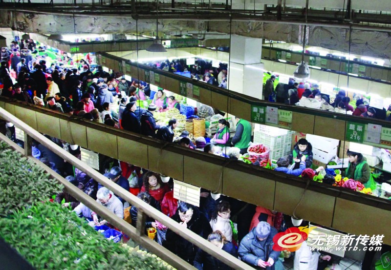 昨天,朝陽農(nóng)貿(mào)市場被四面八方源源不斷涌來的“年貨大軍”塞得滿滿當當,就連過道上都是人擠人,一分鐘有3600多人涌向扶梯。春節(jié)臨近,昨天無錫放晴,馬大嫂們紛紛抓緊時間備年貨。上周六起,節(jié)前消費高峰就已“蠢蠢欲動”,被周日上班一攪和,直到昨天才正式啟動——接待“年貨大軍”17-18萬人次,僅蔬菜的日交易量就在120噸以上。   該市場負責人華艷告訴記者,該市場所有的管理員、后勤人員、保衛(wèi)科員工以及保安等全部出動,到市場周邊引導(dǎo)車流、人流,以維持路面交通的通暢,同時在上下樓扶梯安排人手維持秩序。在電梯上行入口維持秩序的管理人員數(shù)了數(shù):1分鐘內(nèi)有3600個人進入農(nóng)貿(mào)市場。