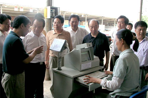 朝陽股份公司總經理錢韌、副總經理王漢如向省領導介紹了朝陽公司抓好蔬菜基地建設,并運用電子手段,建立蔬菜檢測檔案、實現與基地的聯網,做好蔬菜的市場準入工作,確保蔬菜等農產品的食用安全。省領導還繞有興趣地參觀了市場的網絡電子秤結算系統。