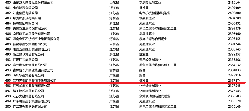 9月25日,全國工商聯在湖南長沙發布了2021中國民營企業500強榜單,江蘇無錫朝陽集團股份有限公司以237.79億元營業收入,位列第495位。 	據了解,今年是全國工商聯連續組織開展的第23次上規模民營企業調研,共有5785家企業參加。今年民營企業500強入圍門檻達235.01億元,比上年增加32.97億元。數據顯示,上榜民營企業多項整體指標繼續向好,顯示民營經濟的蓬勃活力。2020年民營企業500強的營業收入總額35.12萬億元,增長16.39%;納稅總額達1.36萬億元,占全國稅收總額的8.84%;員工總數1109.11萬人,增長6.26%,占全國就業人員的1.48%。 	   |