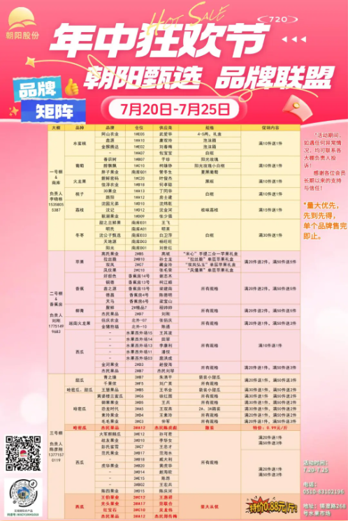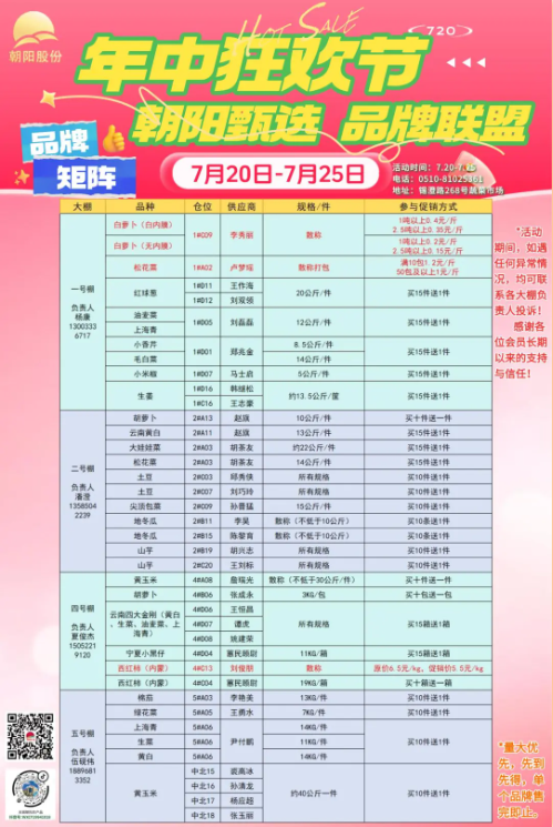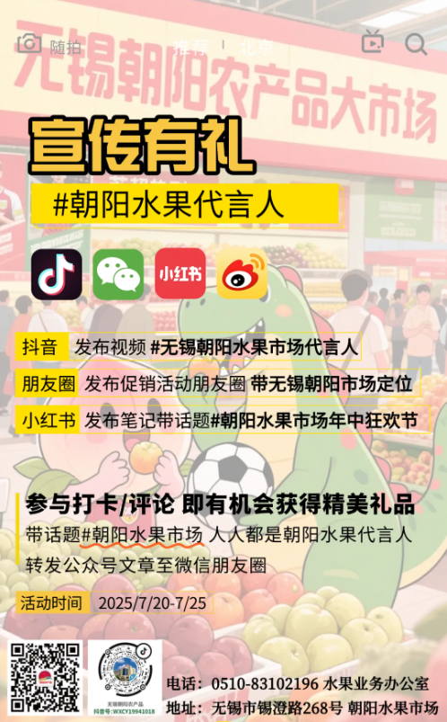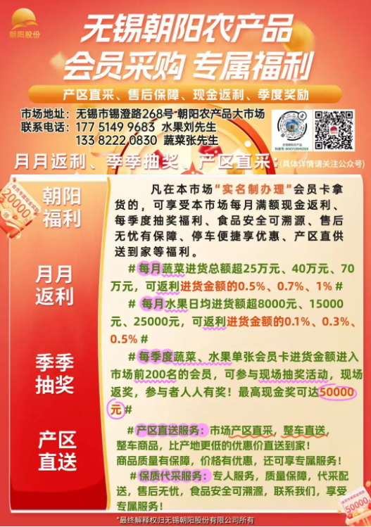 無錫朝陽農(nóng)產(chǎn)品大市場   	朝陽菜果  年中狂歡節(jié)   	盛大開啟!  	會員采購 專屬福利:產(chǎn)區(qū)直送服務、保質(zhì)代采服務、售后保障、現(xiàn)金返利、季度獎勵。  	無錫朝陽農(nóng)產(chǎn)品產(chǎn)區(qū)直采服務火熱進行中,整車直送,百億補貼!更低的價格、更高的品質(zhì)、更全的保障!  	高溫橙色預警!  	急需補充一點能量!  	無錫朝陽農(nóng)產(chǎn)品大市場  年中狂歡節(jié)  	品牌矩陣大集合,會員尊享!  	超多水果蔬菜品牌大促  	更有西瓜0.88元/斤、  	哈密瓜0.99元/斤、  	白蘿卜0.15元/斤、  	松花菜1元/斤  	快來搶購吧!  	宣傳有禮!  	成為朝陽水果代言人!  	抖音:發(fā)布朝陽采購視頻,帶 #無錫朝陽水果市場代言人話題, 并且艾特@無錫朝陽農(nóng)產(chǎn)品 抖音官方。  	朋友圈:轉(zhuǎn)發(fā)促銷活動朋友圈,帶 無錫朝陽水果市場定位  	小紅書:發(fā)布筆記話題,一起來聊一聊朝陽, 并帶 #朝陽水果市場年中狂歡節(jié)話題。  	   	發(fā)布抖音視頻,艾特官方, 即有機會被抽中,贈送精美禮品!  	快快加入!為朝陽打call!  	    |