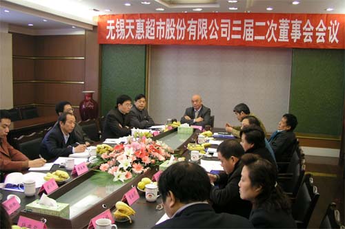 無錫天惠超市股份有限公司三屆二次董事會會議于2005年11月25日在無錫召開。會議審議通過了行政工作報告和財務工作報告。確定了2006年度目標。并通過了股權結構調整的預案。會議決定于2005年末召開第八次股東大會。