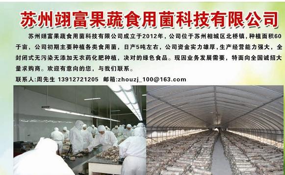 蘇州翊富果蔬食用菌科技有限公司成立于2012年,公司位于蘇州相城區北橋鎮,種植面積60于畝,公司初期主要種植各類食用菌,日產5噸左右,公司資金實力雄厚,生產經營能力強大,全封閉式無污染無添加無農藥化肥種植,決對的綠色食品。現因業務發展需要,特面向全國誠招大量求購商。歡迎有意向的您,與我們聯系。聯系人:周先生 13912721205 郵箱:zhouzj_100@ |